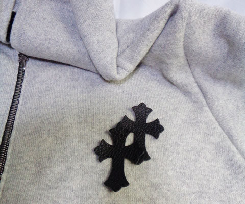 クロムハーツ グレーのパーカーにクロスパッチを5枚カスタムします。 パーカーにクロスパッチを5枚カスタム
