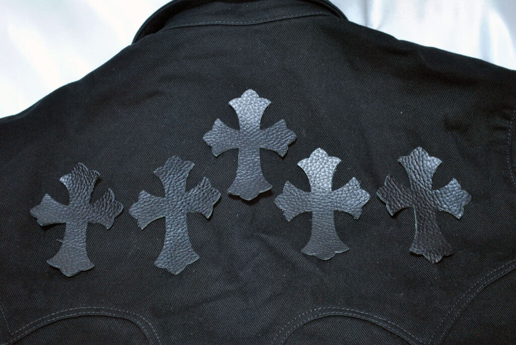 クロムハーツのブラックデニム シャツジャケット背面に、クロスパッチを縫い付けカスタムしました。