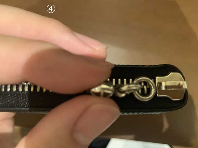 持ち手が短いのでファスナー開閉に支障が出そうなら写真④の様にリングを増やす(あまりやりたくありませんが)