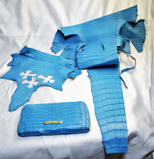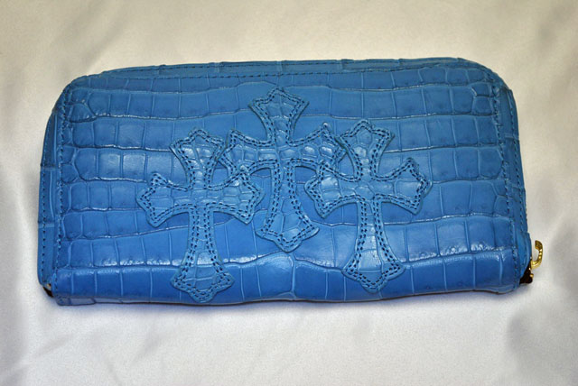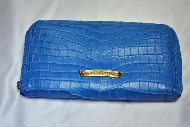 クロムハーツのラウンドジップウォレットをブルーのワニ革に張り替えました。