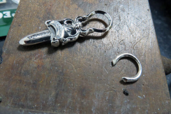 クロムハーツ アリゲーター ウェーブウォレットのファスナーからダガーのパーツが外れたので修理しました。 ダガーの引き手の環が摩耗して薄くなり、スライダーも少し変形しています。 スライダーは耐久性の高いステンレス製のパーツ … 続きを読む クロムハーツ アリゲーター ウェーブウォレット ファスナー引き手のダガー修理