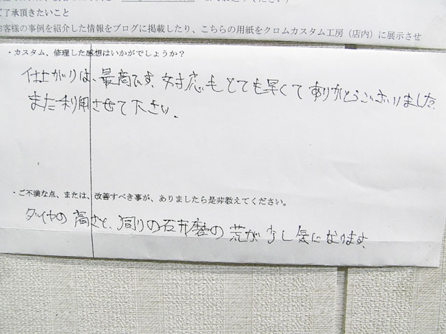 仕上がりは、最高です。対応もとても早くてありがとうございました。