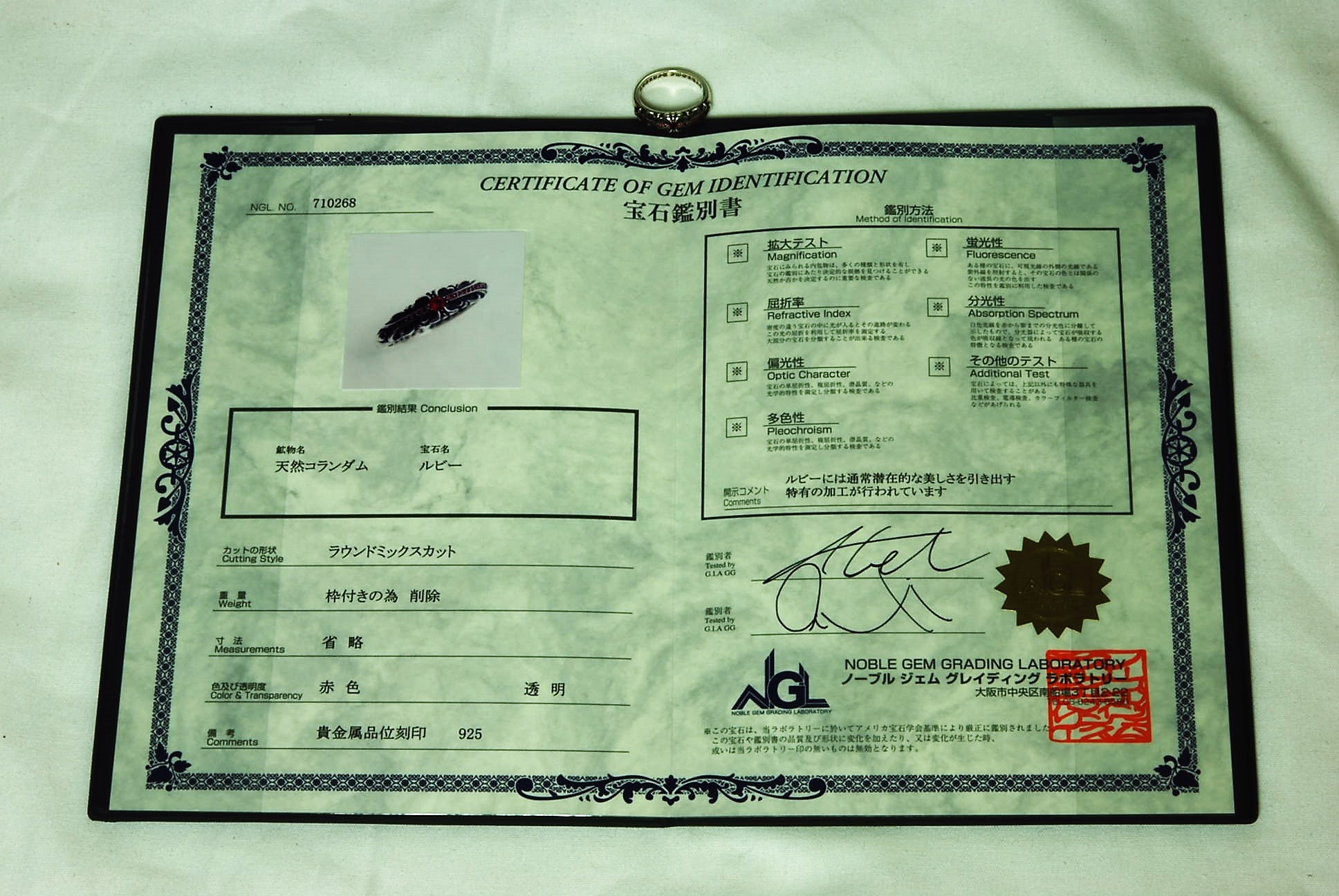 ルビーを証明する宝石鑑別書です。